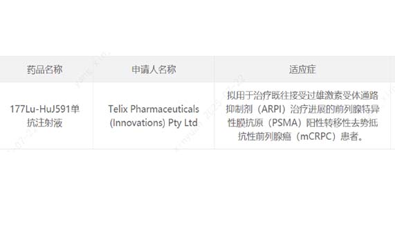 7月22日,中国国家药监局药品审评中心(CDE)官网公示,Telix Pharmaceuticals申报的1类新药177Lu-HuJ591单抗注射液获批临床,拟开发治疗既往接受过雄激素受体通路抑制剂(ARPI)治疗进展的前列腺特异性膜抗原(PSMA)阳性转移性去势抵抗性前列腺癌(mCRPC)患者。
